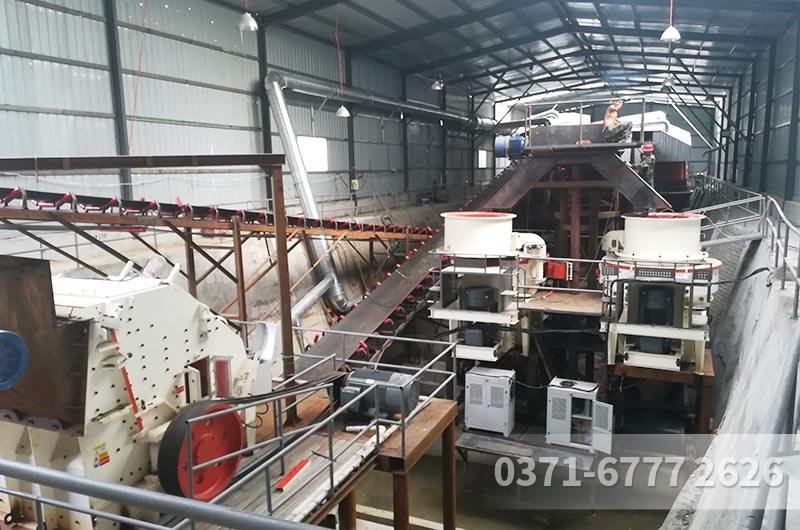 振動給料機在制砂生產線中為破碎機械連續均勻地喂料,并對物料進行粗篩分。