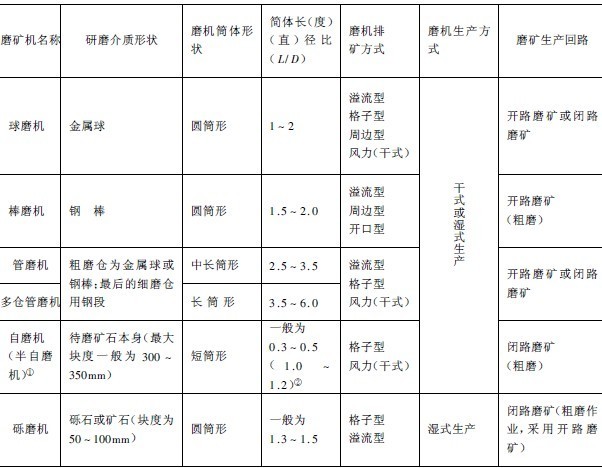 圓筒型磨機(簡稱磨機)規格以筒體內(直)徑和內長(度)尺寸表示。工業生產中廣泛應用的磨機種類很多,分類方法亦不相同,有的按照研磨介質的形狀分類,有的根據筒體形狀分類,有的按排礦方式分類,也有根據磨礦生產方式分類。各類磨機的主要類型和圓筒型磨機的分類方法,分別如圖1 和表1所示。