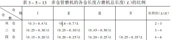 管磨機用于開流(路)系統時,選取較大的長徑比,一般L=(3.5-6.0)D;用作閉流(路)系統時,選用較小的長徑比,一般L=(3.5-6.0)D。多倉管磨機各倉(室)的長度按實際情況確定。但在許多情況下,磨機后的一個倉室(細磨倉)的長度長,各倉(室)占筒體有效長度的百分數,如表3-5-13所示。