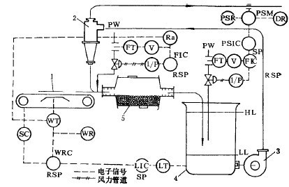 圖2是磨礦作業(yè)自動(dòng)控制的又一實(shí)例。圖中有兩個(gè)控制回路:一個(gè)是控制產(chǎn)品粒度的回路,用來(lái)調(diào)節(jié)水力旋流器的供礦泵池的加水量,從而調(diào)節(jié)旋流器作業(yè)濃度,滿足分級(jí)粒度的要求;另一回路用來(lái)控制磨礦機(jī)給礦量和給水量,其控制的變量是水力旋流器的供礦泵池的液位。給料重量指示、控制器WIC按來(lái)自給料皮帶的稱量傳感器的信號(hào)和遠(yuǎn)程設(shè)定值RSP來(lái)調(diào)節(jié)皮帶速度調(diào)節(jié)器SC,給料重量記錄于記錄器WR上。磨礦機(jī)的給水量PW由比例器FPa調(diào)節(jié)。比例器接收來(lái)自重量傳感器WT的信號(hào)和由測(cè)孔板測(cè)取并經(jīng)過(guò)開方處理的給水量信號(hào)。經(jīng)過(guò)變換處理后,比例器發(fā)出的信號(hào)控制流量調(diào)節(jié)器PIC的設(shè)定值。FIC發(fā)出的電流信號(hào)經(jīng)過(guò)“電流/電壓”變送器I/P變成風(fēng)壓來(lái)控制閥門,使磨礦機(jī)的給水量同新給料量成正比。毫安代表礦量的信號(hào),送到電子電位差計(jì)(12),進(jìn)行指示與記錄。機(jī)組各部運(yùn)轉(zhuǎn)正常之后即可起動(dòng)磨機(jī)之給料設(shè)備。磨機(jī)在未給料的情況下運(yùn)轉(zhuǎn)時(shí)間不允許過(guò)長(zhǎng),一般不可超過(guò)10-15分鐘,以免損傷襯板和多耗鋼球。