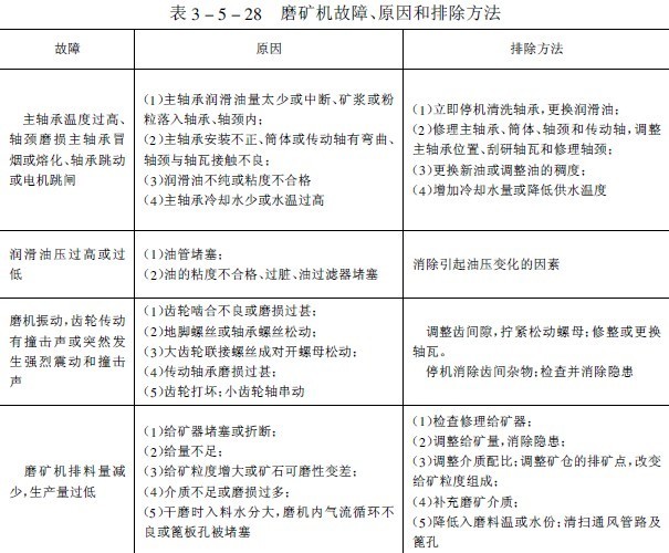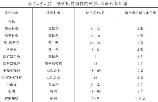 我國(guó)選礦廠生產(chǎn)實(shí)踐中球磨機(jī)易損件的材質(zhì)、使用壽命和設(shè)備用量列入表3-5-27中。常見(jiàn)故障、原因和排除方法見(jiàn)表3-5-28。在處理量大、磨機(jī)臺(tái)數(shù)多的選礦廠,磨機(jī)修理工作一般都在現(xiàn)場(chǎng)進(jìn)行。中小型選礦廠通常也設(shè)置檢修用的起重設(shè)備。當(dāng)?shù)踯嚻鹬貒嵨惠^小時(shí),可用兩臺(tái)電動(dòng)或油壓千斤頂輔助起重,以便對(duì)磨機(jī)進(jìn)行就地檢修;大型部件一般送到機(jī)修廠修理。現(xiàn)場(chǎng)修理時(shí),需要停車一段時(shí)間,但比較經(jīng)濟(jì)。無(wú)論采用哪一種修理方法,在停機(jī)修理之前都應(yīng)根據(jù)機(jī)組修理記事本中的記錄、事故報(bào)告表、磨礦機(jī)交接班和設(shè)備檢查記錄,編制設(shè)備缺陷明細(xì)表,然后編制設(shè)備修理進(jìn)度表;并規(guī)定各部件或機(jī)臺(tái)的修理順序及可能平行進(jìn)行的修理作業(yè)。