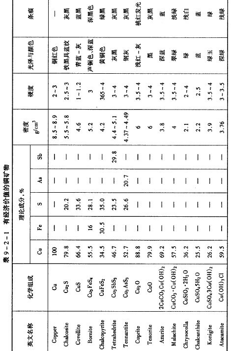 天然產出的含銅化合物即銅礦物總計有200余種,其工業價值及分布狀態各不相。常見的有工業價值的銅礦物大致有15種左右,如表9-2-1所列。由于銅具有強烈的親硫性,從巖漿源到次生富集帶的各個富集階段,銅的硫化物均占首要地位。在世界上有工業價值的銅礦石產量中,有80%的銅礦物是屬于硫化物,而其中大部分是輝銅礦,其余為黃銅礦、斑銅礦、黝銅礦和藍銅礦。自然銅產量僅占10%。其余的5%為氧化物,如孔雀石,藍銅礦,硅孔雀石,水膽礬,氯銅礦等。