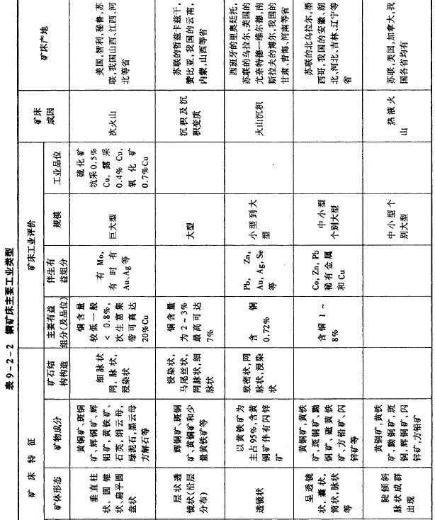 世界上銅礦床的工業類型較多,分類方法也不一,結合我國情況,將主要銅礦床的工業類型列于表9-2-2。