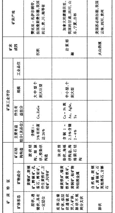 ②層狀銅礦床:該類礦床是被含銅硫化物所礦化的沉積巖,主要是砂巖,并有頁巖、石英巖、白云巖等。主要礦物有:黃銅礦、斑銅礦、輝銅礦、孔雀石、藍銅礦、硅孔雀石,并見少的黝銅礦。共生礦物有:方鉛礦、閃鋅礦、黃鐵礦、褐鐵礦、赤鐵礦、方解石、石英、重晶石等。礦體層數不定,有的一層,也有的數層,厚的可達30米,含銅品位較高,可達2-3%。是銅礦重要的類型。此類礦床在世界上分布廣,蘇聯的哲茲卡茲干,非洲的贊比亞,我國云南的東川、易門、內蒙霍各氣和山西篦子溝、老寶灘等地均有分布。