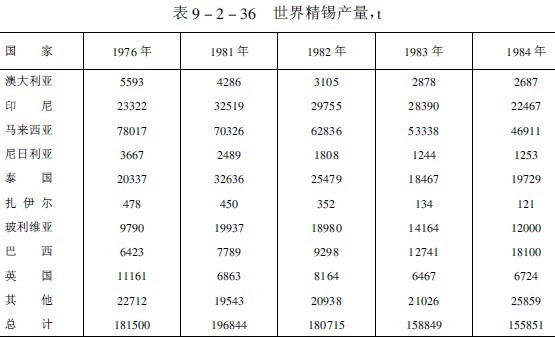 1976年以來,世界錫精礦含錫和精錫的產量列于表9-2-35和表9-2-36(不包括我國、蘇聯和東歐各國)。