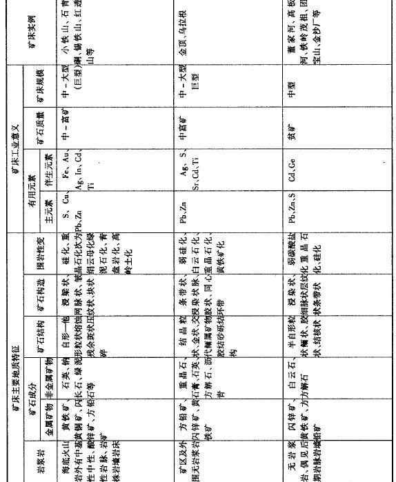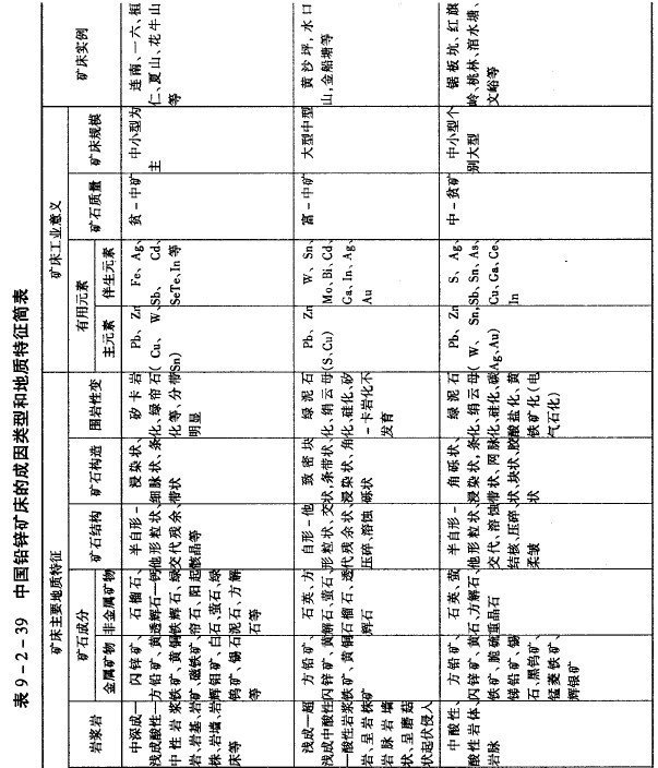 我國鉛礦產量的一半以上,是由這種類型礦床提供的。第三種是黃鐵礦型鉛、鋅礦床,這種礦床與含銅黃鐵礦型礦床的特征相同,只是礦石中含鉛、鋅多些。我國西北地區就有這種類型的鉛、鋅礦床,如小鐵山鉛鋅多金屬礦。第四種是碳酸鹽巖層中熱液交代鉛、鋅礦床,它產于厚層碳酸鹽巖層發育區。產在石灰巖和白云巖中。礦體沿碳酸鹽巖石中裂隙充填交代形成,以交代作用為主。礦石礦物組成以方鉛礦、閃鋅礦為主,并有石英、方解石、螢石和重晶石等。礦石以致密塊狀構造為主,鉛、鋅含量較富。礦石中含有的伴生元素,如銀、稀散元素(鎘、鍺、銦)可供綜合利用。此類礦床規模變化大。湖南黃沙坪鉛鋅礦床就屬于此類型礦床。第五種是碳酸鹽巖層中層狀鉛、鋅礦床,產于石灰巖和白云巖層中。礦體多為層狀,礦化現象一般都是浸染狀。礦石礦物組成主要有方鉛礦、閃鋅礦、有時有黃銅礦;脈石礦物主要為方解石。礦石中鉛、鋅含量不高,但礦床規模往往較大。此類礦床在貴州、湖南等地都有發現。以成因類型劃分的中國鉛鋅礦床的地質特征,歸納于表9-2-39。