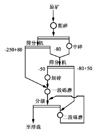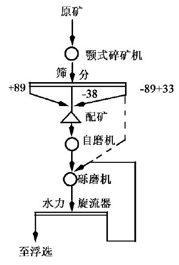 第二段磨礦,第二段磨礦為帶預檢分級的球磨機。這種流程的特點是可提高自磨機的處理量10%-20%,同時可提高系統的給礦晶位。例:瑞典波立登公司瓦斯堡(Vassbo)鉛鋅礦兩段一開路全自磨流程,如圖3所示。