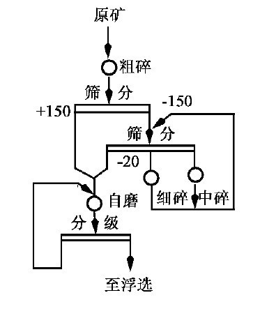 為自磨磨礦介質,然后按一定比例給入自磨機。自磨介質一般占原礦的15%-30%左右,視礦石性質而定。粗碎后篩出的篩下產物約占原礦的70-85%進行中細碎,使其破碎到-20毫米,即相當于一般球磨機的給礦粒度,然后給入自磨機進行磨碎。這樣,自磨機的給礦粒度及介質粒度的大小和數量都能得到控制。